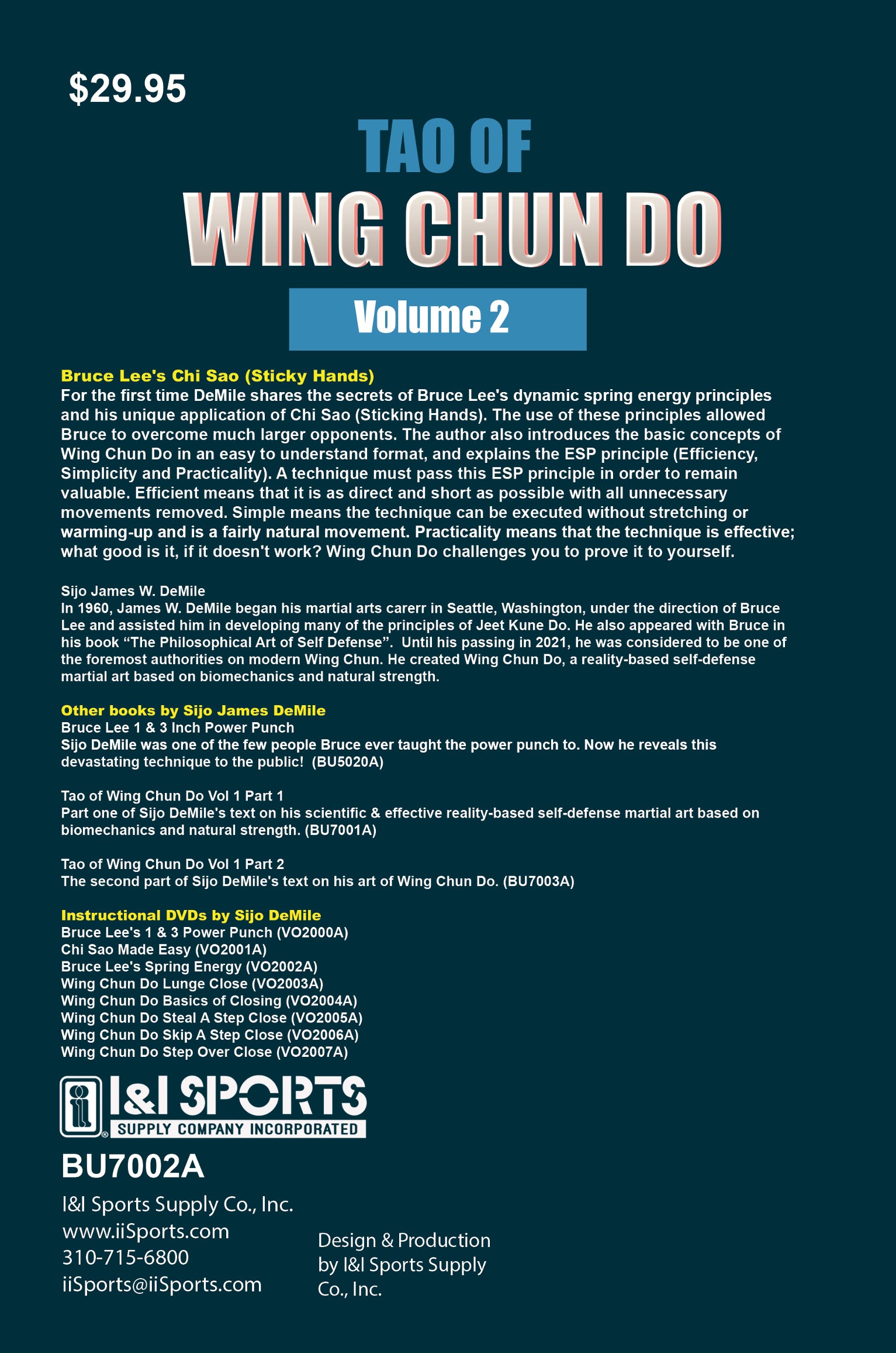 For the first time DeMile shares the secrets of Bruce Lee's dynamic spring energy principles and his unique application of Chi Sao (Sticking Hands). The use of these principles allowed Bruce to overcome much larger opponents. The author also introduces the basic concepts of Wing Chun Do in an easy to understand format, and explains the ESP principle (Efficiency, Simplicity and Practicality). A technique must pass this ESP principle in order to remain valuable. Efficient means that it is as direct and short as possible with all unnecessary movements removed. Simple means the technique can be executed without stretching or warming-up and is a fairly natural movement. Practicality means that the technique is effective; what good is it, if it doesn't work? Wing Chun Do challenges you to prove it to yourself. 128 pages. 6" x 9".