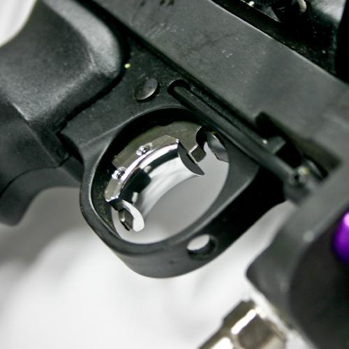 Single Billet Aluminum trigger shoe that comes with two set screws to fasten to an existing trigger of any standard paintball marker or airgun. Universal design with 3/16" wide mounting channel. Precision machined from high-grade aluminum. Extra-hard anodizing process for an extremely durable finish. Made in the USA.