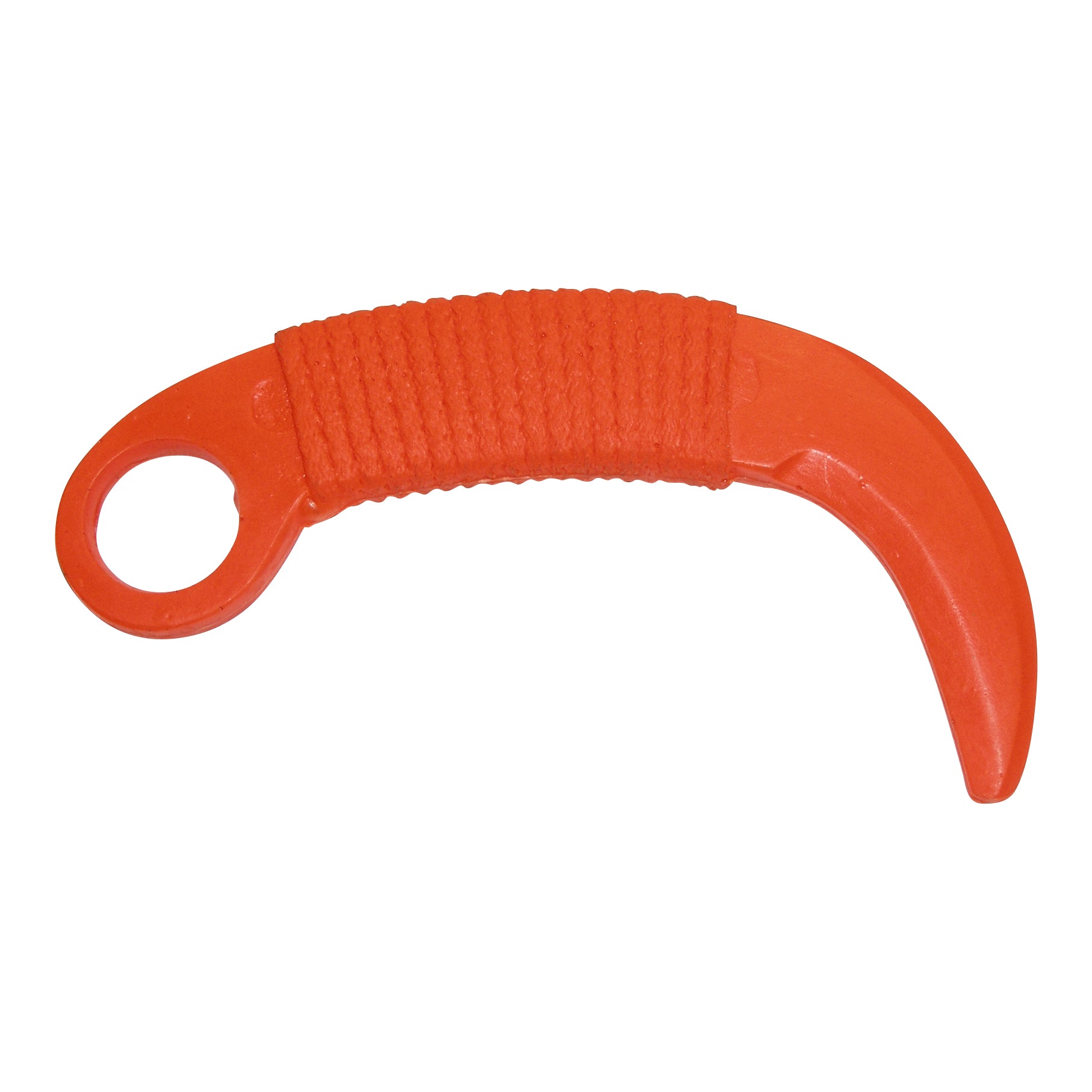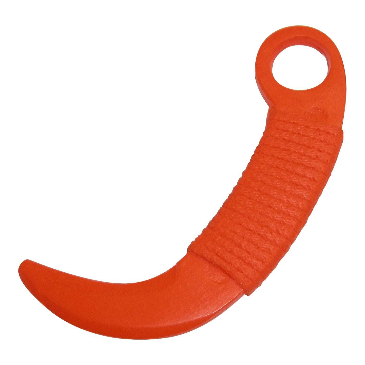 High quality synthetic rubber molded version of the Indonesian Kerambit practice knife. Designed for safe reality-based training. Manufactured in the USA; this rubber trainer features a traditional style extra thick curved blade which is tapered and can easily be covered in chalk for marking cutting points. The signature finger ring at the end is durable; allowing for realistic draws; transitions; and open hand techniques. One-piece construction with simulated cord wrapped handle for a secure grip. Great training tool for Pentjak Silat; Kali and other martial arts of the Philippines and Indonesia. Overall 6.5in x 3.75in x .3in. Good weight and feel. Bright safety Orange. CAUTION: Always train under proper supervision. NOT designed for contact training!