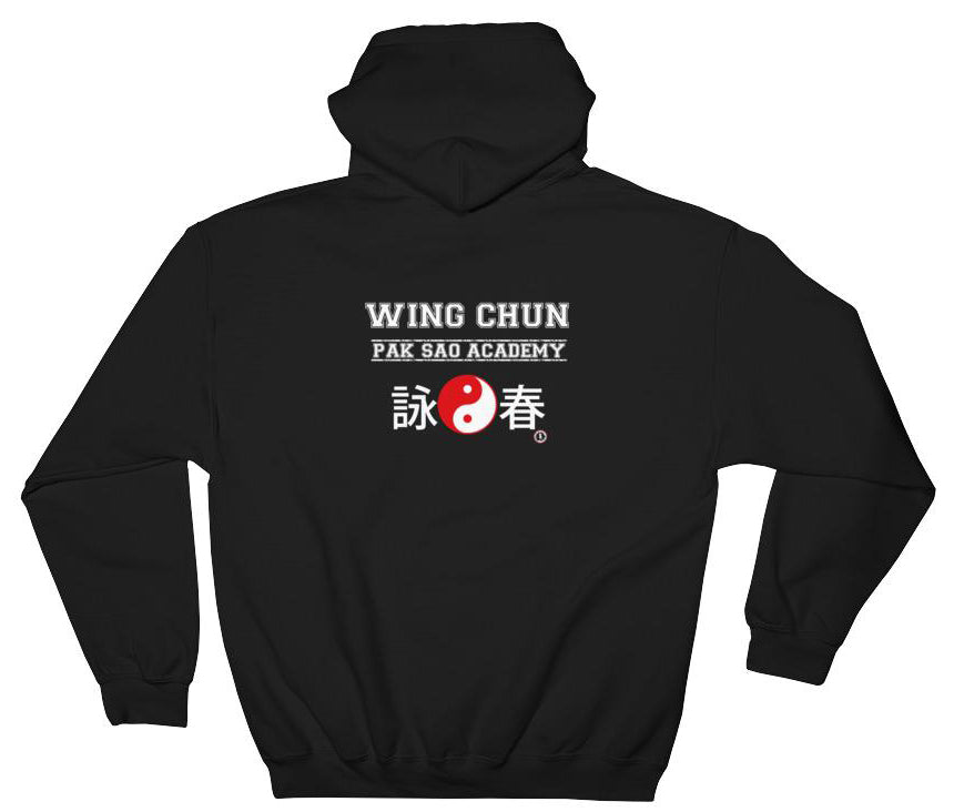 Unique design 'Wing Chun Pak Sao Academy' design on the back of a premium 50/50 cotton/polyester blend hooded black sweatshirt. Double-needle stitched with front pouch pocket and double-lined hood. Perfect casual wear for the martial artist! Adult sizes.