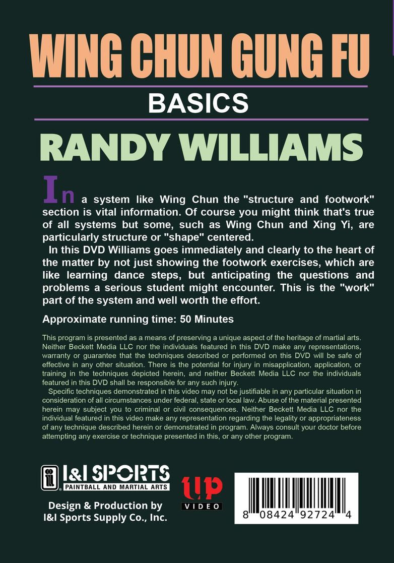 In a system like Wing Chun the 'structure and footwork' section is vital information. Of course you might think that's true of all systems but some, such as Wing Chun and Xing Yi, are particularly structure or shape centered. In this DVD Williams goes immediately and clearly to the heart of the matter by not just showing the footwork exercises, which are like learning dance steps, but anticipating the questions and problems a serious student might encounter. He gives insightful instruction for the Basic Stance; the Eight Punches and Eight Palm Strikes of Wing Chun. Elbow Strikes and Blocking Motions are covered as are the Five Basic Moving Stances. In addition; you will learn the footwork necessary to get the most from the other DVDs in this outstanding series. This is the 'work' part of the system and well worth the effort. 50 Minutes.