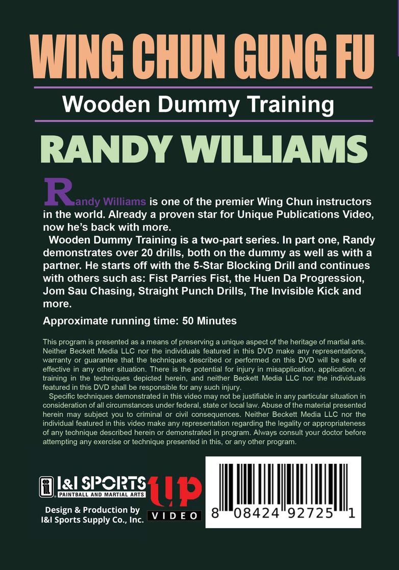 Wooden Dummy Training is a two-part series. In part one, Randy demonstrates over 20 drills, both on the dummy as well as with a partner. He starts off with the 5-Star Blocking Drill and continues with others such as: Fist Parries Fist, the Huen Da Progression, Jom Sau Chasing, Straight Punch Drills and The Invisible Kick.This DVD also provides an introduction to the Lop Sau/Fon Sau Switch, the Chaing Dai Jyeung Switch, the Biu Sau Switch, the Gum Sau Switch and the Pock Sau Switch. He then goes into Look Sau rolling hands and attack combinations, sticky foot, the dummy centerline theory and more. 50 Minutes.