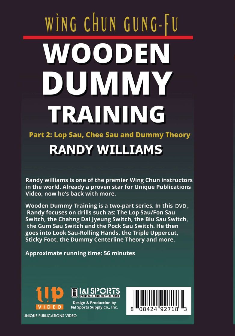 In Part 2, Randy focuses on drills such as: The Lop Sau/Fan Sau Switch, the Chahng Dai Jyeung Switch, the Biu Sau Switch, the Gum Sau Switch and the Pack Sau Switch. He then goes into Look Sau - Rolling Hands, the Triple Uppercut, Sticky Foot, the Dummy Centerline Theory and more! He displays numerous drill combinations on the wooden dummy, following each with the application on a partner. Also, many good drills with an emphasis on outside to inside control of the centerline. Hand combinations, then both hand-leg and leg only combinations. Excellent wooden dummy work for the home student. 56 minutes.