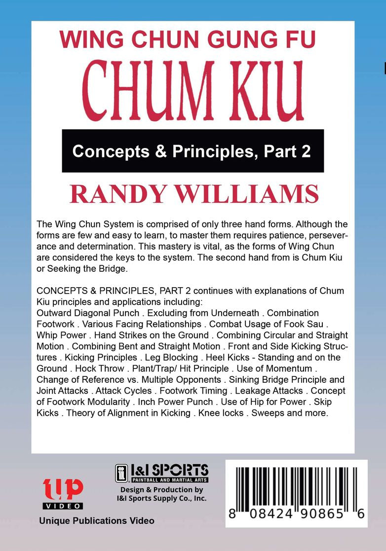 The Wing Chun System is comprised of only three hand forms. Although the forms are few and easy to learn; to master them requires patience; perseverance and determination. This mastery is vital; as the forms of Wing Chun are considered the keys to the system. The first form is Siu Leem Tau or The Little Idea. CONCEPTS AND PRINCIPLES PART 2 continues with explanations of Chum Kiu principles and applications including: Outward Diagonal Punch; Excluding from Underneath; Combination footwork; Various Facing Relationships; Combat Usage of Fook Sau; Whip Power; Hand Strikes on the Ground; Combining Circular and Straight Motion; Combining Bent Motion; Front and Side Kicking Structures; Kicking Principles; Leg Blocking; Heel Kicks--Standing and on the Ground; Hock Throw; Plant/Trap/ Hit principle; Use of Momentum; Change of Reference vs. Multiple Opponents; Sinking Bridge Principle and Joint Attack; Attack Cycles; Footwork Timing; Leakage Attacks; Concept of Footwork Modularity; Inch Power Punch; Use of Hip for Power; Skip Kicks; Theory of Alignment in Kicking; Kneelocks; Sweeps and more! When Steven Seagal; Phil Collins or Eric Clapton needed bodyguard protection; they called Wing Chun master Randy Williams; one of the world's foremost experts on self-defense. Williams; who operates schools in various parts of the world; began training at the age of 13 under George Yau and completed his instruction in the system under world renown master Augustine Fong.