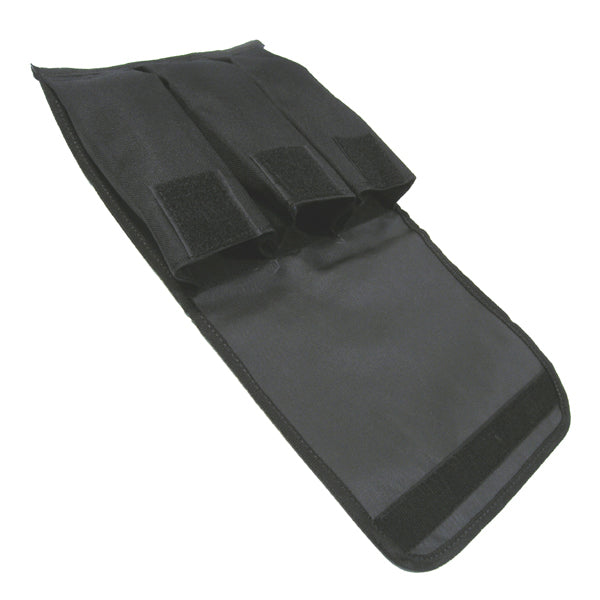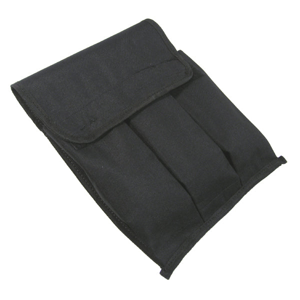 Black triple Paintball pod pouch holds three 90 or 100 round flip-top tubes (NOT included). Constructed of heavy; stain-resistant black polyester webbing. Three separate pouches with 1 hook & loop flap and reinforced stitching throughout. Belt (28"-32") included.
